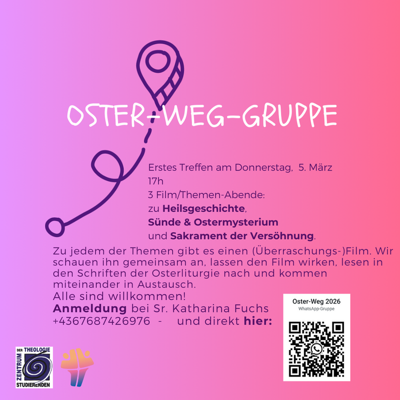 Alle die "noch mehr" wollen, sind herzlich eingeladen zur Oster-Weg-Gruppe:  Erstes Treffen am Do 5. März,17.00 Uhr im Theozentrum: in drei Film-/Themenabenden, mithilfe der österlichen Bibeltexte und im Austausch vertiefen wir unser Verständnis des Ostermysteriums. Mehr Info & Anmeldung bei Sr Katharina Fuchs.