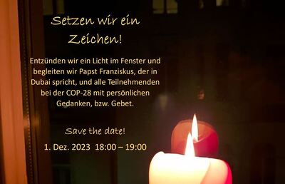 Auf Initiative von Margarete Huber von der Fokolare-Bewegung sind alle herzlich eingeladen, am Freitag, 1.12.2023 von 18:00 – 19:00 Uhr Lichter in die Fenster zu stellen und dabei die Anliegen der Teilnehmenden für einen sozial-ökologischen Wandel gedanklich z.B. mit dem Gebet für die Erde (aus der Enzyklika „Laudato si“) oder anderen Gebeten mitzutragen.