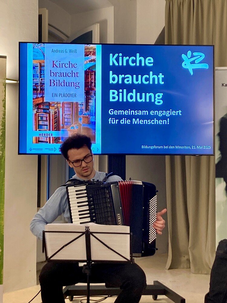In ihrer Begrüßung aller interessierten Teilnehmer:innen nahm Kathrin Karloff, Pädagogische Leiterin des Bildungsforums bei den Minoriten, Bezug zur Aussage Ingrid Brodnigs, es sei notwendig, „Vielschichtigkeit […] sichtbar zu machen, […] zuzulassen und aufzuspüren, [um] weiterhin in einer pluralistischen, demokratischen Gesellschaft zu leben, in der die Vielschichtigkeit nicht als Ballast, sondern als Bereicherung angesehen wird“ (aus: „Wider die Verrohung. Über die gezielte Zerstörung öffentlicher Debatten“ (2024)). Einer der Wege, Vielschichtigkeit fühlbar zu machen, sei die Musik, so Karloff: Die einleitende Interpretation bekannter Bachklänge durch den Akkordeonisten Csanad Orgyan verdeutlichte dies auf passende, feine Weise.