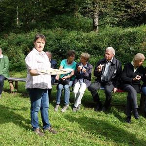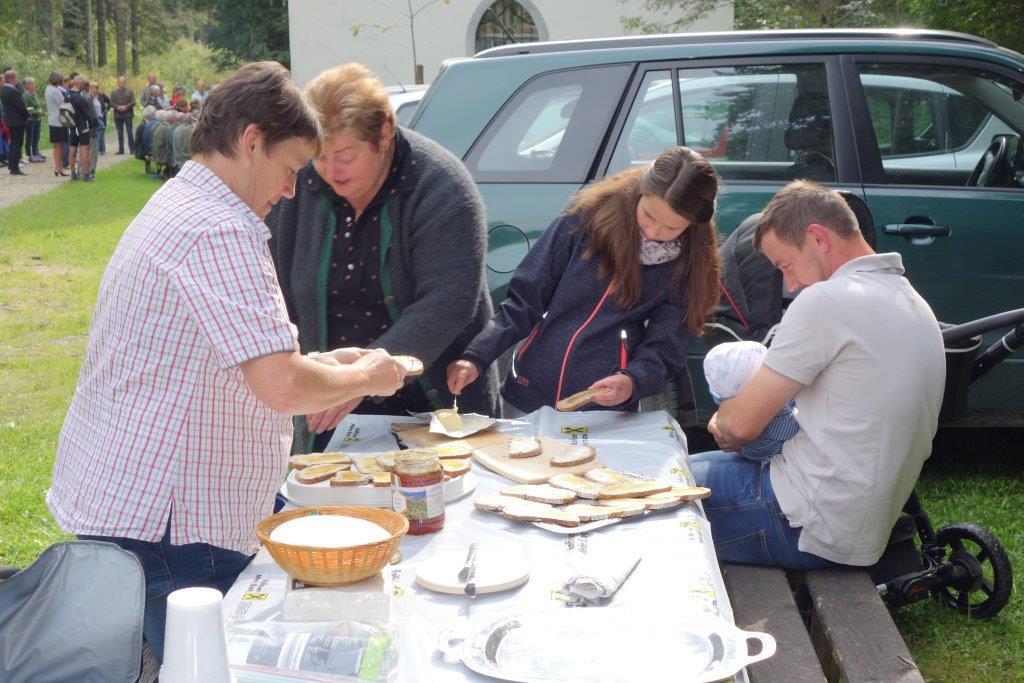 Anschließend kredenzte die Kapellen-Betreuerfamilie Gabriela & Josef Fuchs vulgo Leeb in der Pölla eine traditionelle "Barthlmä-Jause" (Brot, Butter und Honig) auf. Ein herzliches Vergelt`s Gott allen Beteiligten!
