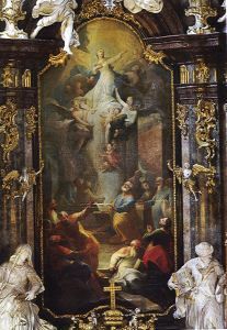Das Hochaltarbild zeigt die Darstellung der Himmelfahrt Mariens, gemalt von Josef Adam Mölk. Während Maria bereits, von Engeln getragen in den Himmel entschwebt, haben die Apostel, die um das leere Grab versammelt sind, noch nicht vollends das Wunder erfasst - überrascht, zum Teil bestürzt, blicken sie um sich.