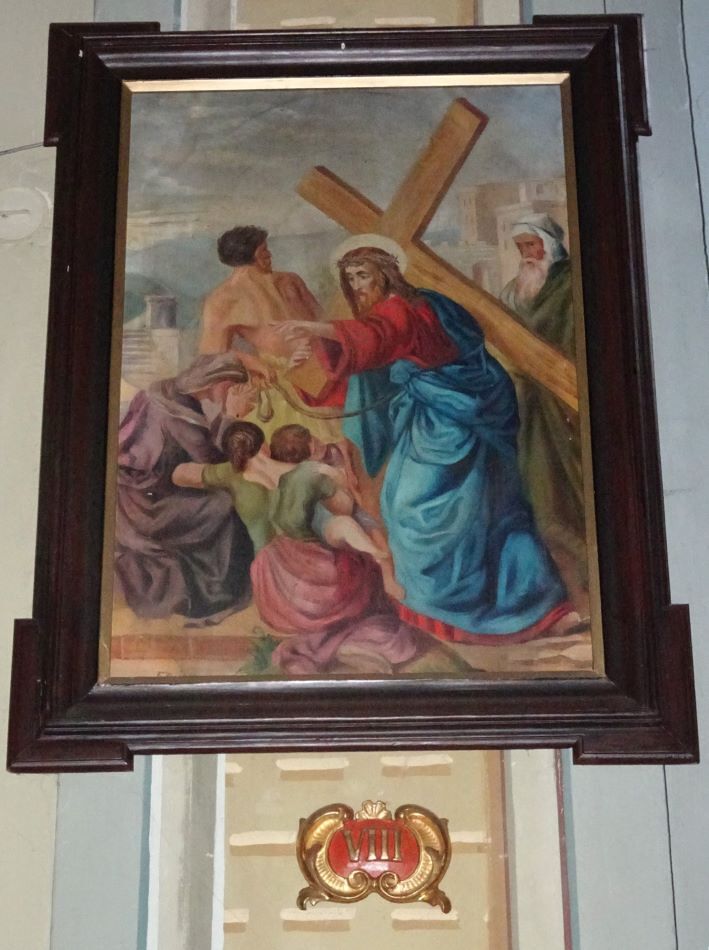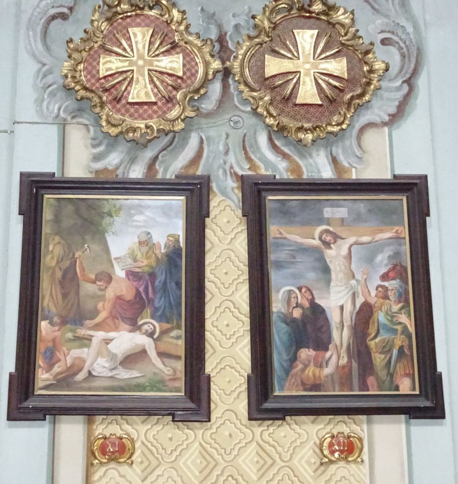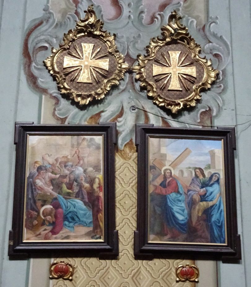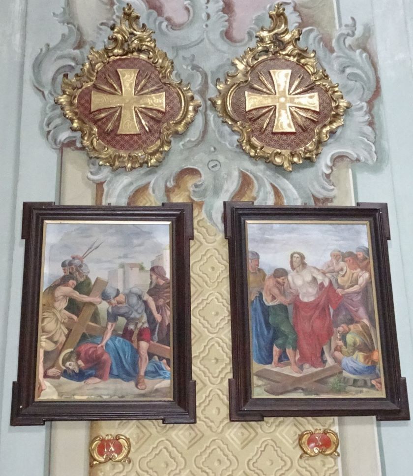 Die Bilder des franziskanischen Kreuzwegs wurden 1913/14 von B. Federspiel „in barocker Malweise“ in Öl auf Leinwand gemalt und 2004 renoviert. Kleine Kartuschen mit den römischen Stationsziffern sind unter den Bildern positioniert. Über 12 der 14 Kreuzwegstationen sind die Apostelkreuze zu sehen: An diesen Stellen wurde die Kirche bei der Weihe 1701 mit Chrisam gesalbt.