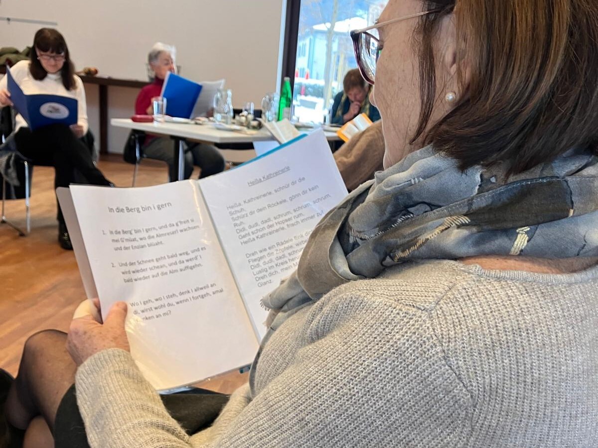 Bei einem Gläschen Wein, Kaffee und hausgemachten Mehl­spei­sen wur­den dann auch einige alt­bekan­nte Lie­der ge­sun­gen. Regina Dietrich be­glei­te­te die Sänger:­innen auf der Gitarre und die mit­ge­brach­ten Texte ver­lei­te­ten die Gäste zum Mit­singen.