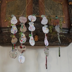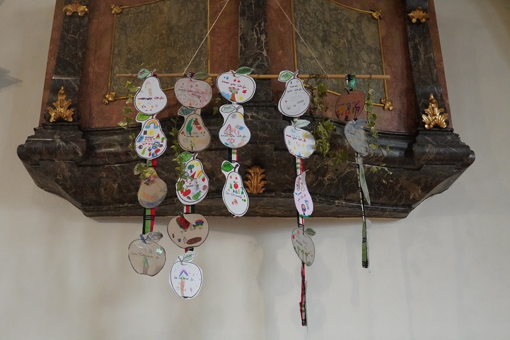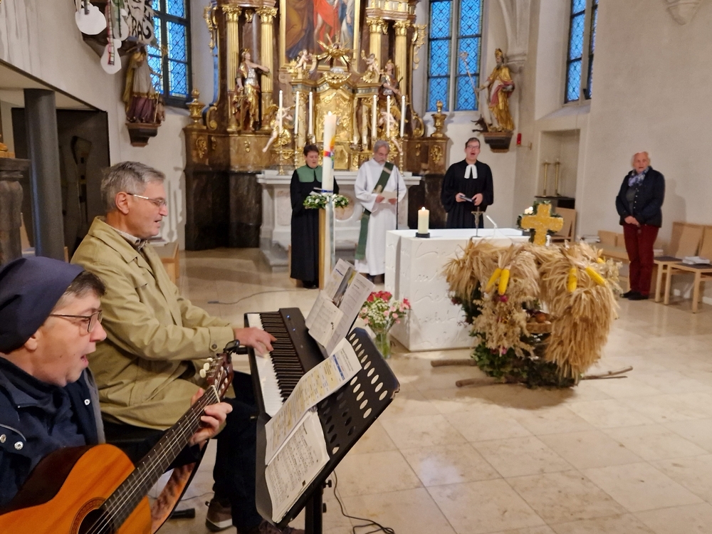 Von der schwungvollen Musik unserer Musikgruppe begeistert, sangen wirklich alle gerne mit, vom Kirchenchor bis zu den VS-Kindern, deren besonderer Erntedankschmuck übrigens nun die Empore im Altarraum ziert.