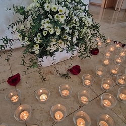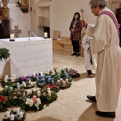Vor dem Altar brannten 59 Teelichter für alle Menschen, die im letzten Jahr in unserer Pfarre verstorben sind. Ihre Namen wurden noch einmal laut ausgesprochen. Ein Teelicht leuchtete für alle Verstorbenen, die ungenannt blieben.