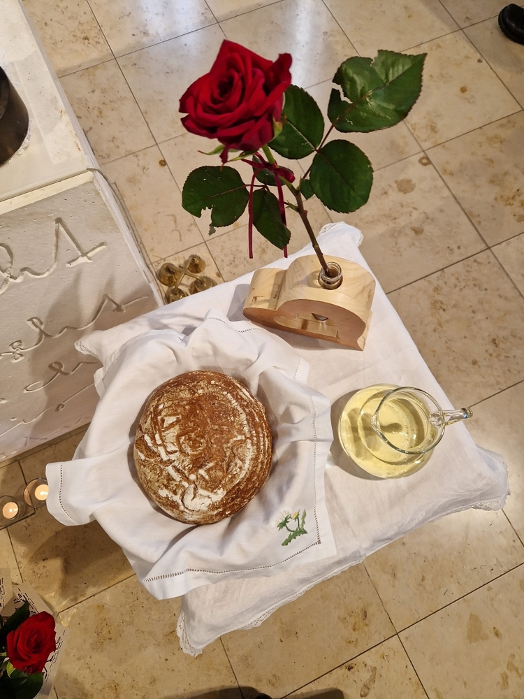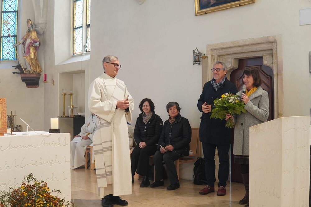 Vor dem Schlusssegen überreichte Ernst Pock im Namen der Pfarre dem neuen Diakon ein Aspergill, mit dem dieser gleich voll Freude die Gläubigen segnete. Für seine Ehefrau Eva, die ihm begleitend zur Seite steht, gab es einen Blumenstrauß, mit den besten Wünschen für sie.